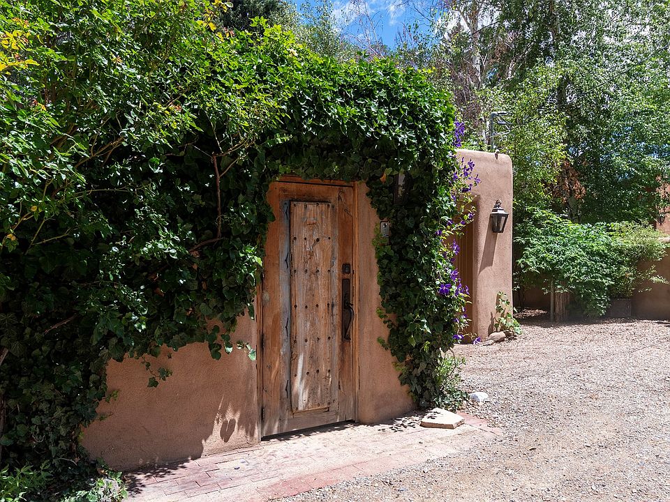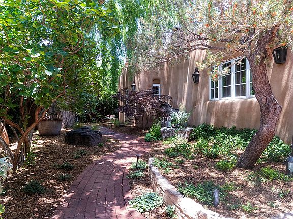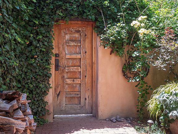 As Santa Fe authentic as it gets! Award winning Prull Construction & Hoopes Architects Historic 'Remodel of the Year 2015' with finishes brought to life by David Naylor Interiors. Be transported through the vine wrapped old world iron tacked door into a secret garden behind private adobe walls, off the famous 'Street of Souls.' Enter the welcoming foyer and into the Double Parlor with gracious Living and Drawing Rooms, featuring Vigas, Beams, Skylights, Original Restored Hardwood Floors, Diamond Finished Hard Troweled Plaster, & Solid Core Doors. Beautiful Mullion Windows & French Doors let in the bounty of the garden. This 2 Bedroom 2 Bath Adobe Home with 1 Bed, 1 Bath Guest Casita is surrounded by history, and is lovingly restored and updated for the most comfortable of pied-a-terre living. Near the Plaza, Canyon Road, and Museum Hill, and a gentle walk or ride to Kaunes, Downtown Subscription, or local shops and restaurants. The completely enclosed yard has an enchanting wrap-around garden including 2 wonderful fountains, a rose trellised pergola perfect for lounging or eating al fresco, mature landscaping with multiple varietals, 100 year old growth trees, and lovely pathways and respites. The Cooks Kitchen is wonderfully appointed and boasts a Breakfast Nook & Central Island seating, Wolf Gas Range, Dual Wolf Ovens, Subzero Refrigerator, Quartzite Countertops, Solid Wood Soft Close Cabinetry, Dual Dishwashers, and a Countertop Kiva Fireplace. A Formal Dining Room enhances daily meals as well as entertaining. Chic Ancient meets Modern bathrooms are given rich character with beautiful Chocolate Walnut Travertine Tile, Petroglyph inspired inset designs, Beautiful Faux Bois Bronze Hardware, Robern Illuminating Medicine cabinets and great storage. Painted decorative Peñasco Streebe doors pepper the home, amplifying the cultural richness of this classic adobe pueblo with a twist.