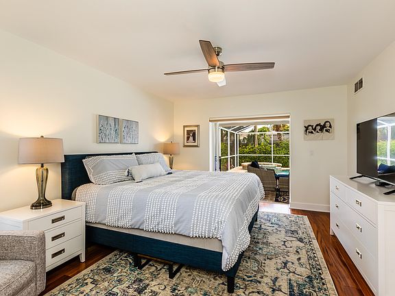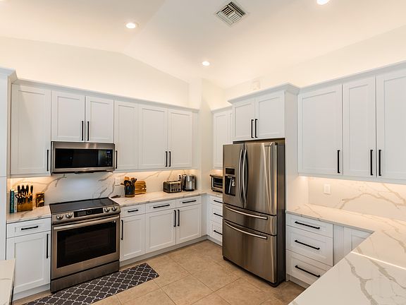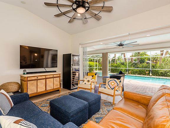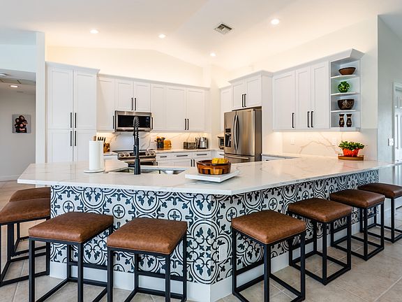 Absolutely stunning newly renovated inside and out, pool home with coastal design, offering four bedrooms, two baths and den. This gorgeous home has an open concept living/kitchen/dining area. The kitchen features a large quartz bar with seating for eight, with stainless steel appliances, matching quartz backsplash and beautiful dark blue accent tile under the bar area with white shaker style cabinetry, crown molding and under cabinet lighting. This home boasts tile throughout, plantation shutters and sleek lined shades on the pocket sliders. The master bedroom, living area and dining area all have pocket sliders opening out to the spacious brick paved lanai. The lanai is huge with under cover seating area and large area for sunning. The salt water pool and spa have been updated as well with glass tile accents and waterfall feature spa with LED lighting. This home sits on an oversized lot with side entry garage and extra large driveway. The outside has been updated with new exterior lighting, new landscape, beautiful decorative blue shutters and decorative coastal stucco design. Shows like brand new construction. Furnishings are negotiable. New Roof 2019.