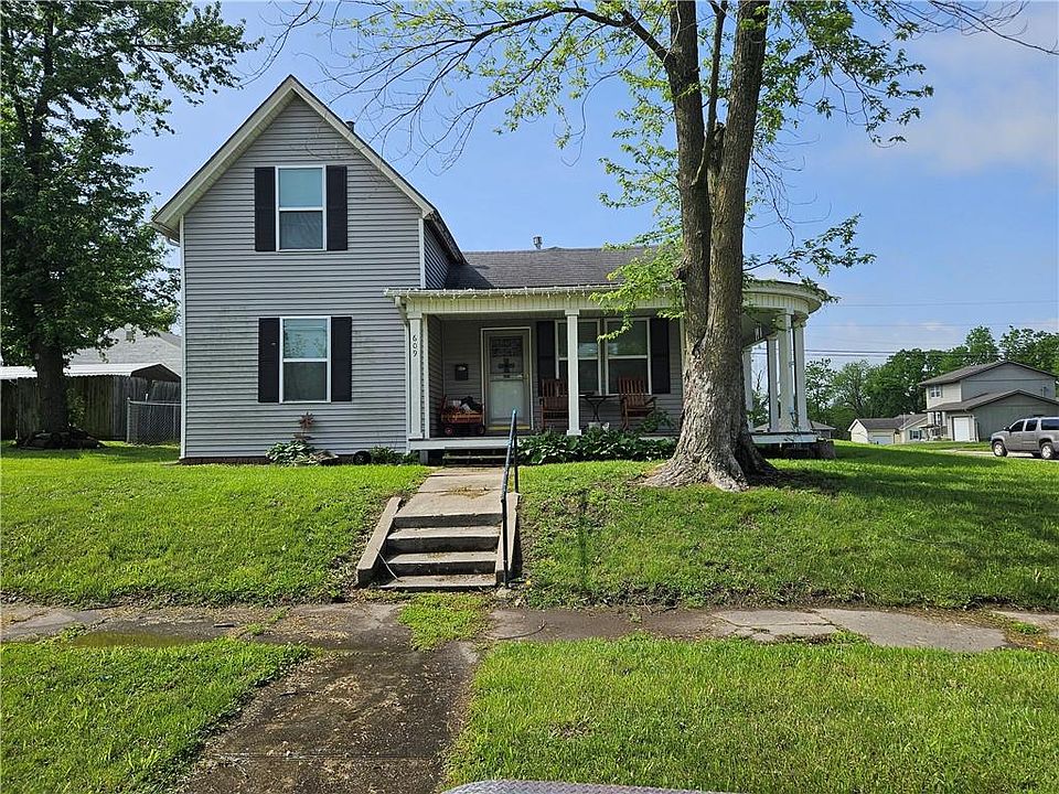 Very cute 3 bedroom, 1 bath house just a short distance from the Historic Paola Square. Corner lot with nice fenced in back yard with patio perfect for entertaining, grilling out or sitting around a fire pit. Redone kitchen, redone bath with double vanity. Wood floors in dining room and living room.