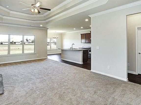 A open floor plan that's sure to please! Foyer leads to a spacious great room and kitchen area that's large enough for the whole family. This four bedroom 2 full bath home has an isolated master suite on one side and 3 other bedrooms and bath on opposite side. The large open great room has a double treyed ceiling with crown molding, a beautiful gas log fireplace embraced by stone and a mantel. A wonderful kitchen with pantry and loads of counter/cabinet space an island with bar for additional sitting area and a dining area. Privacy Fenced back yard and covered patio. Pool, clubhouse, fitness center and tennis courts are located in community. One owner home less than 2 years young.