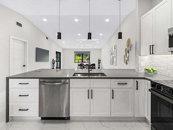 Welcome to Huntington Pointe! Completely renovated and professionally designed, this 2 bed 2 bath showcases modern upgrades with 32'' X 32'' imported porcelain tile flooring. Custom lighting includes LED mirrors, pendants and hi-hats in every room. Relax on your enclosed patio w/ A/C. The sleek kitchen features white shaker cabinets, stainless steel appliances, quartz countertops, under-cabinet lighting and abundant cabinet space with a spacious pantry. New A/C & HWH. Enjoy your quiet street, spacious driveway, garage with epoxy flooring and lush landscaping on the exterior. Huntington Pointe is an active adult community featuring a brand-new renovated clubhouse with multiple swimming pools, social clubs, pickleball, fitness center, sauna, steam room, an on-site cafe, a theater and more.