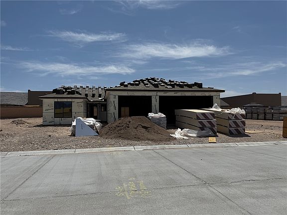 When complete, this new home will be the "Tucson" Model, 1,587 SF with 3 Bedrooms, 2 Bathrooms, and a 3 Bay Car Garage. 11' double side gate will allow for RV or general storage. Plenty of time to choose colors, countertops and flooring! Builder Value Package of Upgrades includes block wall, wrought iron fencing, front yard landscaping, tile flooring, kitchen backsplash, and Granite, Corian or Quartz counter tops, insulated garage with garage door opener(s), just to name a few of included items. No HOA dues until Club House, Pool, Pickleball courts and other amenities are completed and usable by homeowners. Fairway Village Estates is Located near medical, shopping and Laughlin Nevada for gambling, dining and entertainment. Only one spec home still available with side yard storage!