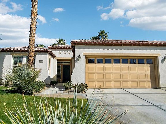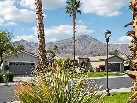 Step into resort-style sophistication with this impeccably maintained Maurea plan nestled behind the gates of Trilogy La Quinta, an exclusive 55+ paradise. This stunning 1,386 sq. ft. retreat, offered TURNKEY furnished with golf cart, offers 2 bedrooms, 2 bathrooms, and an inviting sparkling saltwater pool, perfect for ultimate relaxation. Designed for seamless indoor-outdoor living, the open-concept great room boasts picturesque pool views, a TV/media niche, elegant plantation shutters, and sleek tile flooring throughout. The adjacent chef's kitchen dazzles with upgraded black stainless-steel appliances, slab granite countertops, a gas range, custom backsplash, and a convenient breakfast bar--ideal for casual dining. The primary suite is a tranquil escape with direct French door access to the pool, an en suite bath featuring dual vanities, a large shower enclosure, new 'comfort height' toilets (in both baths) and mirrored closet doors. Guests will feel right at home with their own private quarters. Outside, entertain in style with a built-in BBQ station, expansive pergola, and a spacious concrete deck--all set against the backdrop of La Quinta's stunning landscape. Just moments from the Santa Rosa Clubhouse and world-class amenities, this is desert living at its finest!