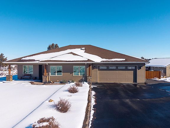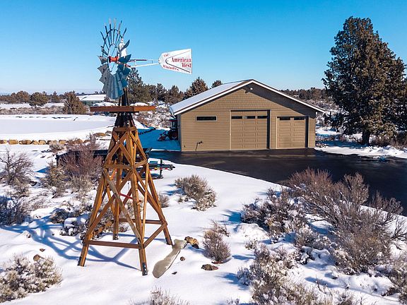 Stunning 9.93-acre property just east of Bend, featuring 7.7 acres of irrigation, a 1445 sq ft shop, and a beautifully maintained single-level home surrounded by lavender fields. Built in 2015, this home showcases quality finishes throughout. The open-concept design is bright and airy with vaulted ceilings, a propane fireplace, and a kitchen with a Travertine-tiled island, granite countertops, stainless steel appliances, custom Hickory cabinetry, and ¾-inch distressed Hickory floors. The dining area includes a large built-in buffet with wine storage. The primary suite offers wool carpet, a walk-in closet, and a luxurious bath with radiant floor heating, a tiled shower, and a soaking tub. There's also a dedicated office and a three-car heated tandem garage. The covered porch, with its cedar ceiling, overlooks the irrigation pond. The shop features three bays, natural light, water and propane connections, insulation, and a mini split for climate control.