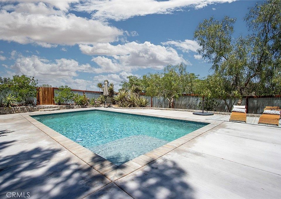 Pool house paradise! And now a huge price reduction. Lush three level landscaping with greenhouse, sheds and raised garden beds. This 4-bedroom, Office/Den, and 3 bath property features dining area with stone fireplace, exotic acacia wood flooring, new dual pane windows, new interior paint and trim throughout. Vaulted ceiling patio with stonework and ivy invites entertaining or meditation space. Newly renovated kitchen features solid wood fronts with soft-close hardware, quartz countertops, farmhouse sink, backsplash tiles from Spain, new appliances (including induction oven also plumbed for gas oven as well). Newly renovated laundry room and pantry with floor to ceiling matching cabinets, high efficiency washer and dryer, and modern tiles. Pomegranate, lime, fig, plum, apricot, and avocado trees flourish on the estate with a timed irrigation system, along with several patio seating areas including a large poolside deck. The house sits up on a rise, giving exquisite sunset and sunrise views of the mountains and valley. Sweeping sky views at night with twinkling town lights as a distant backdrop. Two block walk to Nancy Karl Trail in Joshua Tree National Park or Friendly Hills play park. Less than a mile from highly desirable Friendly Hills elementary school. Perfect privacy in a serene verdant setting.