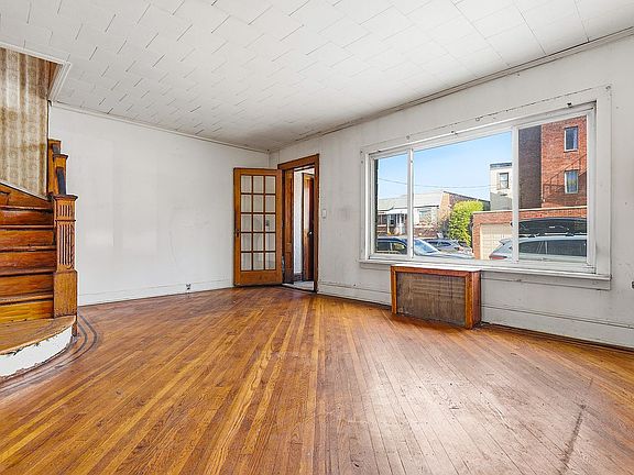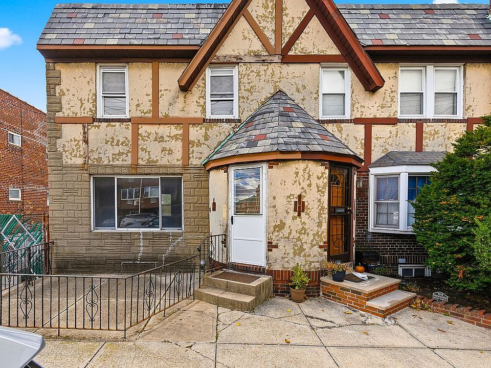 this attractive solid brick stately tudor is anxiously awaiting your fresh new design. the 20ft building width allows for a wide array of comfortable layouts. the open first floor plan encourages the hardwood floors to flow nicely throughout the home. a full finished basement has a seperate outside entrance that leads to a wonderful rear yard. the property is perfectly positioned as the last house in a community driveway, this affords it the opportunity for its current layout of tremendous sundrenched, peaceful green space that is perfect for the family, pets or enjoying those quiet breezy summer afternoons. you could also transform part of the yard to an abundance of parking, easily fitting multiple vehicles. the well perched master bedroom provides a stunning nightly sunset view of the never tiring manhattan skyline. amazing convenient location with close proximity to eliot ave, metropolitan ave and fresh pond rd with all their shopping, dining and transportation options including the m train and multiple bus lines