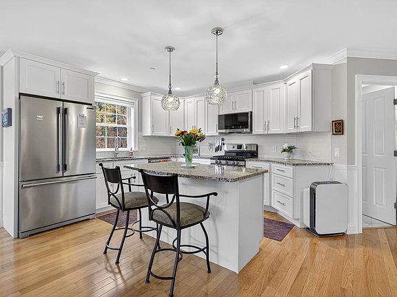 Showcasing refined design & modern living, this sunny northeast-facing end unit at Windsor Crossing is filled with natural light, warmth, & thoughtful details. The private hallway entry opens to a bright, open-concept layout featuring a stunning kitchen w/ white cabinetry, crown molding, granite countertops, matching backsplash, soft-close cabinets, & a large island with Frigidaire appliances and a new microwave, perfect for entertaining. The living & dining areas offer gleaming hardwood floors, elegant wall panel detailing, crown molding, and a cozy gas fireplace with black tile. Step onto your private balcony, ideal for morning coffee or evening relaxation. A dining alcove provides extra space and versatility. The spacious primary suite features a walk-in closet & a beautifully appointed bath with double vanity, quartz counters, tiled walk-in shower, & white tile floors. The 2nd bedroom is ideal for guests or a home office, with both bedrooms featuring brand-new carpet with latex padding & moisture-retaining foam. The guest bath includes a vanity with quartz counters and tub/shower combo. Add'l highlights: in-unit laundry (Electrolux W/D), new water heater, heated garage parking, & 4X5 storage unit. Pet-friendly & professionally managed, with walking trails & nearby rec center includes: a pool, tennis & pickleball. Just min from downtown Exeter with cafés, shops, parks, & restaurants like Ani’s Bagel Café, + Route 101 & I-95 for easy commuting. Open House 11/1 10-12pm