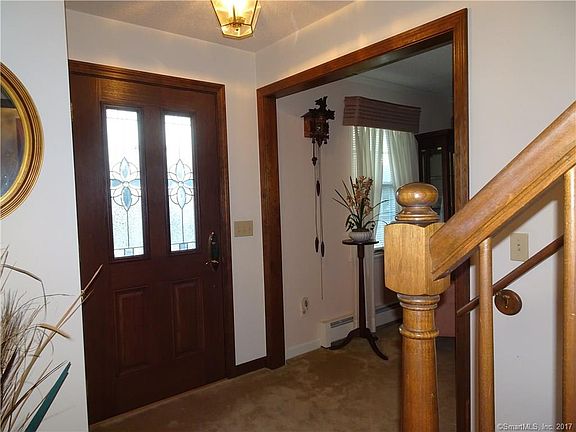 Breath taking Saltbox Colonial with its formal living room with fireplace, formal dining room opening to kitchen with Quartz breakfast bar and counter tops. The backslash is Tavertine, fairly new appliances, lots of cabinets and skylights. Kitchen also opens to comfortable size family room with lots of windows and door to garage, door to covered front porch and artrium doors to large deck overlooking private and very pretty yard with large shed and gardens. First floor bedroom could serve as master bedroom. First floor has a full bath next to bedroom. Upstairs there is an adorable landing with a skylight. Perfect for reading, homework or a computer station. Large bedrooms and bathroom upstairs are both spacious and comfortable. Bathroom has a jetted tub, large vanity and is very roomy. Home has 6 panel doors throughout, 3 zone heat, 2 double door closet in each bedroom. The roof, leaf guard gutters, skylights and front door are newer. Included is the water softening system, i/g sprinkler system, central vaccum. There is also lots of storage in this home. Appliances staying in as-is condition. Belongings in shed will not convey.