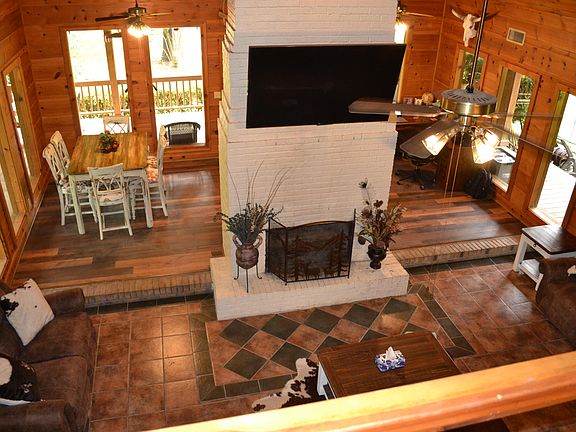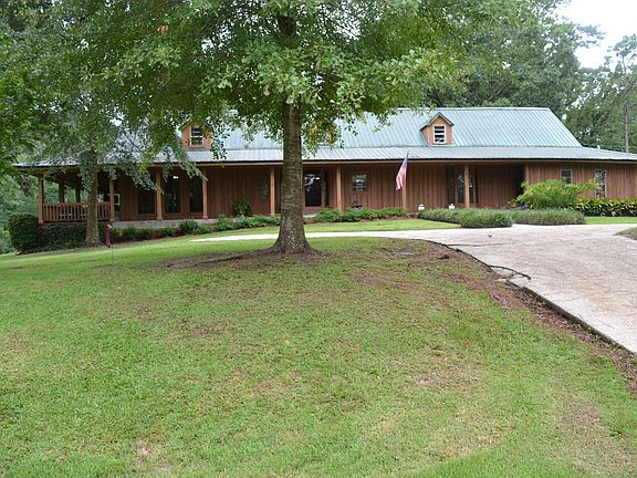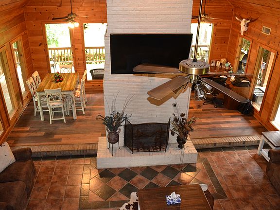 Rustic custom built home with wrap around porches and on approximately three acres with a private pond that has been stocked. An open floor plan includes a great room with a high ceiling, a cozy fireplace, a dining area, and flex space. An expansive master bedroom with a bathroom are located downstairs with two additional bedrooms, bath, a landing, and additional storage upstairs. The staircase overlooks the great room. There is a fenced area in the backyard for children and pets. This home is perfect for those wanting a tranquil, private setting.