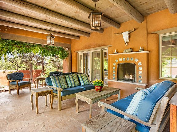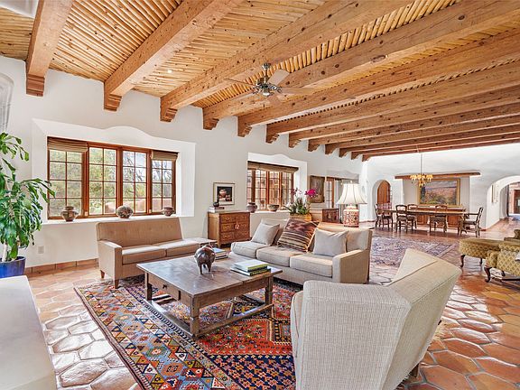 One doesn’t simply just buy a Buzz Bainbridge property; one acquires an iconic aesthetic, a lifestyle, an environment of luxurious beauty to live in among his signature Santa Fe features: genuine handmade Adobe walls, some 30" thick; large open room spaces with gorgeous wraparound views and gorgeously embellished high ceilings, wonderful finishes with vigas and latillas and nichos, and kivas, and all the creature comforts of happy living. The intelligent floor plan opens onto gorgeous courtyards, portals, patios, and gardens abounding with high old trees, fountains, and established perennial flowers that embrace the property on the sprawling 7.5 acres. There is even a nurturing, part subterranean greenhouse for year-round blooms and vegetation. The double Adobe main house has three bedrooms, each with its own bath, each with a fireplace, while up the driveway sit the lovely two-bedroom guest house… privately separate, but close enough to borrow a cup of sugar! An additional art studio by the guesthouse with bathroom and fireplace can be an art space or a third bedroom on the guesthouse. There is no HOA to instruct you! The elegant location on prestigious Calle San Martin is 8 minutes to De Vargas mall and 10 to the airport! Yet you feel like you are unwinding in the country! Already pre-inspected with imperfections cured. This is opportunity knocking…!