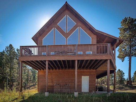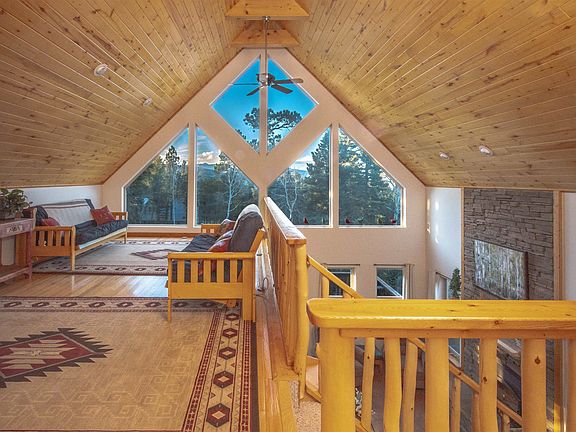 Discover this custom-built rustic retreat - a 4 bedroom, 3 bathroom chalet with Wheeler Peak views and exceptional attention to detail. With over 2,400 sq ft of living space, this home includes a fully equipped 500 sq ft studio apartment with private garage entry, offering the perfect guest quarters, owner’s suite, or rental opportunity. Step inside to soaring ceilings anchored by a dramatic BIS Ultima wood-burning fireplace, framed floor-to-ceiling Harristone stone wall. The oversized loft spans more than 400 sq ft and overlooks the living room and extends to a wall of windows, filling the home with light and mountain views. Solid oak hardwood floors, warm-toned tile with tumbled stone accents, and solid wood Southwestern-style doors bring rich texture and warmth throughout. Thoughtful upgrades include soundproof insulation in all interior walls and ceilings, energy-efficient design, and a cast-iron tub with colorful Mexican porcelain sink in the primary suite. Outdoor living is just as impressive with an expanded wrap-around deck (12’ wide instead of standard 8’) and a private balcony off the primary bedroom, perfect for taking in sunsets or watching elk and deer wander across the open space bordering two sides of the property. The circle driveway makes access easy year-round and provides extra parking. Additional highlights include a finished garage with electrical in place for future expansion, furniture with distinctive Southwest character, and the peace of knowing no additional neighbors will be building next door. A private, yet accessible location, abundant natural beauty, and thoughtful custom features make this home truly move-in ready and a standout value in Angel Fire. This is a short walk to Monte Verde Lake. Seller is offering $5,000 credit at closing for deck staining.