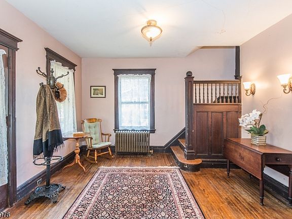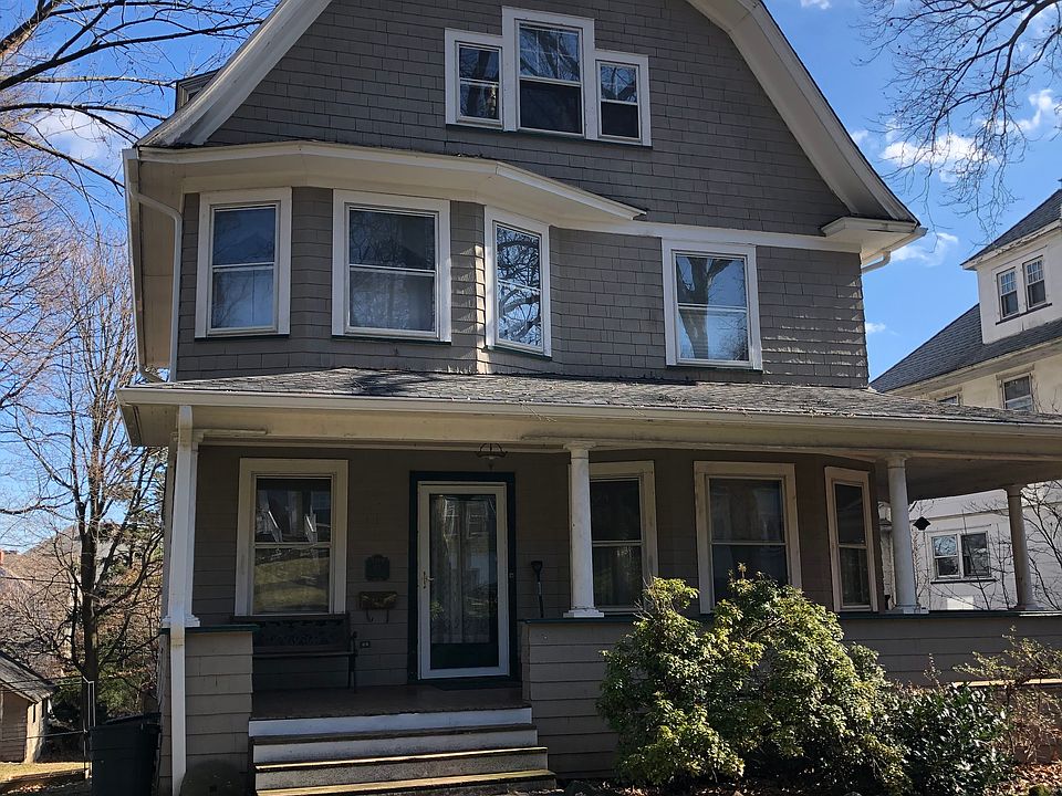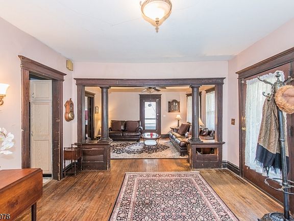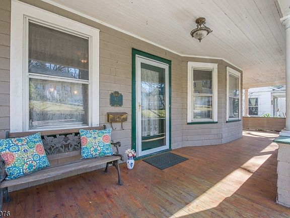 Gracious 5-bed 2-bath Colonial boasting wraparound porch, leaded glass, HW flrs, pocket doors & natural woodwork, nestled on a desirable Glen Ridge street, near shopping, restaurants & NYC transport. Spacious foyer w natural woodwork & fabulous wood colonnades opens to large LR w crown moldings & door access to the wraparound porch. Formal DR w pocket doors features a brick FP & built-ins. Oversized EIK w commercial grade SS appls, servant stairs to 2nd floor & sliders to back deck overlooking level backyard. 2nd fl has office, 3 big bedrooms w ceiling fans, full bath & linen closet. 3rd fl has 2 large bedrooms, full bath & extra storage. Big unfinished walkout basement has storage, utility & laundry rooms & door to large backyard & the 1-car garage. Near shops & restaurants, NYC Bus, & jitney to train.