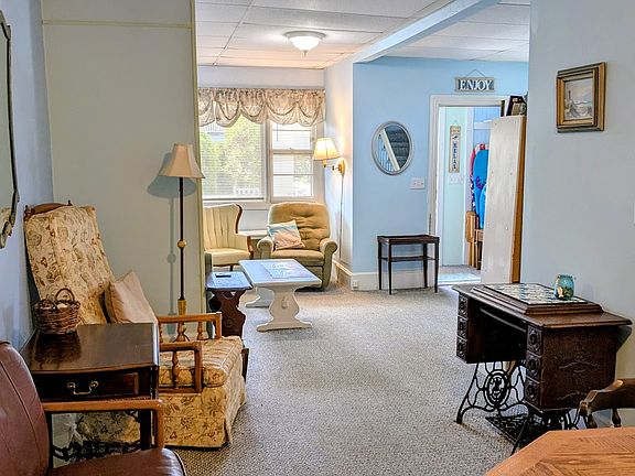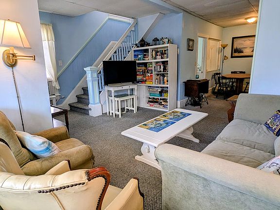 Living room has comfortable seating for 8 (comfy sofa, recliner, rocking chair, and 3 other chairs). Dining room area has game/dining table with four chairs but seats more using chairs from kitchen.