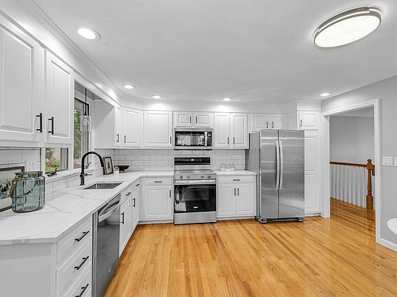 Stunning multi-level contemporary home in Dedham’s highly sought-after Greenlodge neighborhood, ideally situated on a rare double cul-de-sac. This move-in ready gem features a sleek white kitchen with quartz countertops, stainless steel appliances, and recessed lighting. The spacious primary suite offers a beautifully tiled ensuite bath and easily fits a king-sized bed. Enjoy the expansive living room on the main level and a cozy fireplace in the lower-level family room. A sun-drenched porch, two and a half stylish bathrooms, hardwood floors, and fresh interior paint add to the home's modern appeal. The lower level also includes a small office with walk-out access to the nicely landscaped yard, a laundry room, and ample storage. A two-car garage completes this exceptional property. Don’t miss this rare opportunity in a prime location—style, space, and comfort await!
