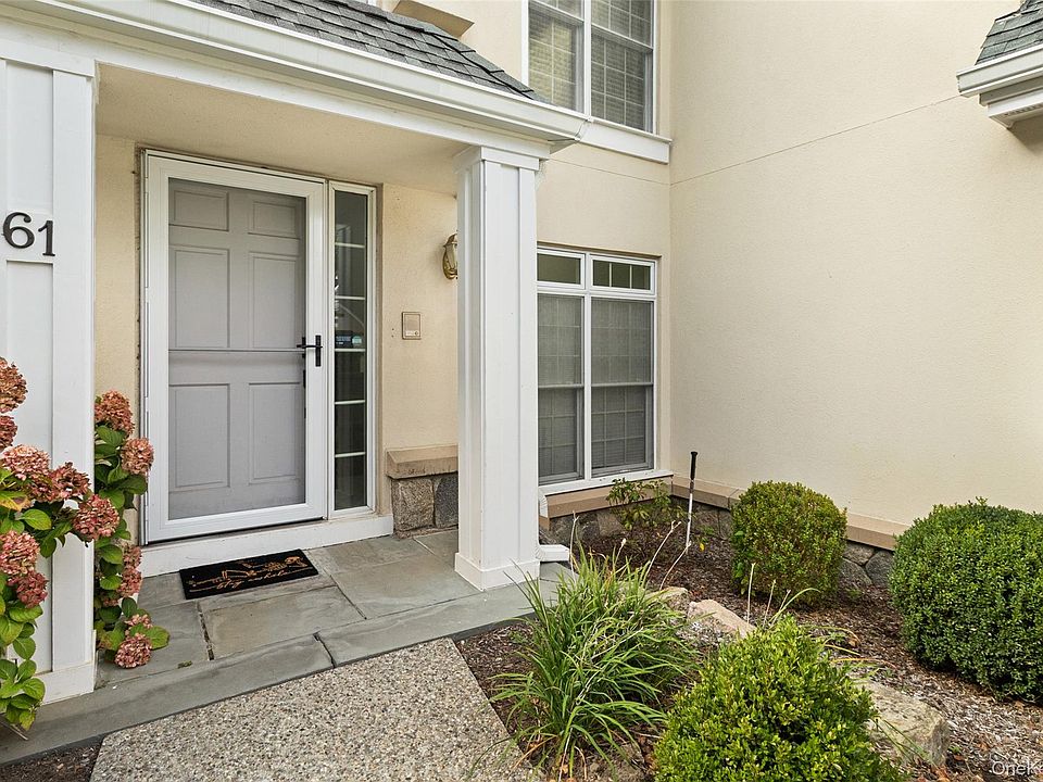 Welcome to 61 Doral Greens West. This 2 bedroom, 2 bathroom home features 1,508 square feet of open space with gorgeous sunset views. Enter the foyer with coat closet and step upstairs to your inviting floor plan. The eat-in kitchen features stainless steel appliances and leads to a dining room & living room featuring a wood burning fireplace and sliders to your private deck overlooking the beautiful Doral Greens property. The spacious primary bedroom en-suite with soaking tub, dual vanity & shower with spacious closet. The second bedroom offers a full bathroom and a creative work space and a separate laundry room. There is a one car detached garage just steps away with pull down stairs for added storage. Doral Greens offers homeowners great amenities including a clubhouse with fitness center, private pool with hot tub, walking trails and two tennis courts. Doral Greens is also conveniently located close to all major highways, Greenwich, White Plains and Rye and is located in the Award Winning Blind Brook School District.