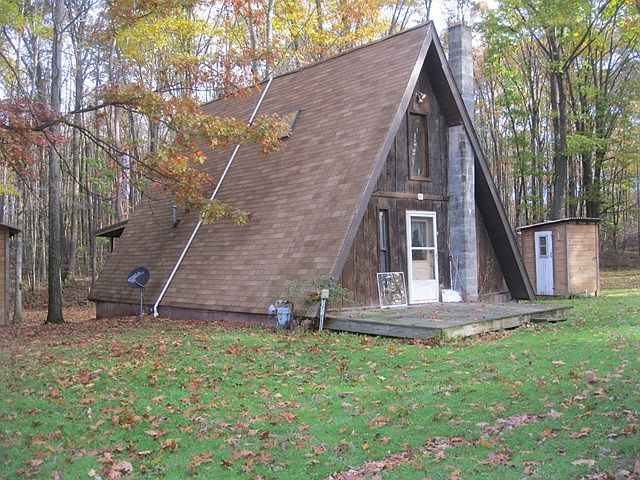 Seasonal or year round living. 1 acre of land. Large Oak trees, hunting and fishing in the neighborhood. Cozy economic living in this A-Frame cottage, Barn/shed on the site, small brook runs behind. Deck looking into the woodlands. New carpet in the loft area.