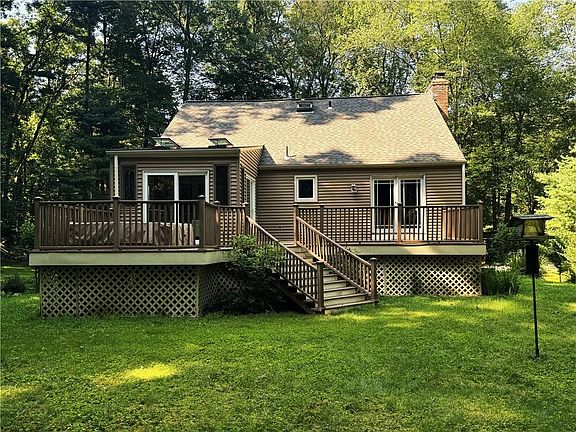 Beautiful Modern Colonial, 3 bedrooms, 2-full baths, hardwood flooring, 2 x 6 construction. Modern kitchen with granite countertops, stainless appliances. Many surprises throughout, gorgeous sunroom, loft, finished basement, heated gutters and more. The sunroom leads to the rear deck and hot tub. Warm living room woodstove framed with decorative stone. Chimney has 2-steel liners. Dining area gives you sliders to the rear deck. Walk up the staircase to the upper loft and Primary Bedroom suite with its own full bath. Central vac. A nicely finished basement. and storage area with a walk out basement & sliding doors. The tandem, deep garage has an automatic garage door opener as well. The yard, Oh the yard boasts beautiful flowers, shrubs and curving small walls. This home sits a bit off the road, down the paved driveway to the natural stone entrance. Schedule your viewing today!