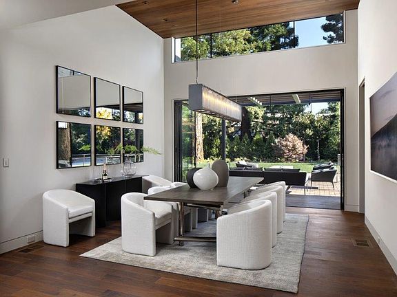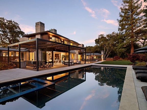 Extraordinary home in the Menlo Circus Club area of Atherton, built by Owen Signature Homes in a sleek contemporary style with elevator access to all 3 levels. Blackened stainless steel, cedar, natural stone & clear glass inside and out. Walnut floors, wool carpeting in all the bedrooms, curbless showers, radiant heating & solar-powered electricity. Incredible kitchen with dual islands & enough built-in seating for everyone to join in with the chef! Entertaining continues on the lower level with a recreation area for lounging, games, & media - all opening to a vast waterfall terrace. Full bar, wine cellar for over 2500 bottles, & a cinema-quality theater with sound-proof walls & leather seating for 9. Fitness center, massage room, & spa bath with Japanese soaking tub & steam room. 6 bedrooms in the main house including the upstairs master suite plus a 1-bedroom guest house with full kitchen. Pool, spa, fire pit terrace, bocce ball court. Menlo Park schools.