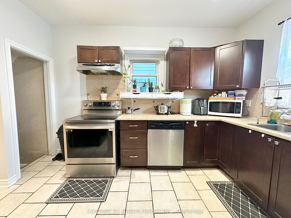 Spacious open-concept kitchenStunning stainless steel appliancesCeramic backsplashBreakfast barPot lightsSliding doorsFully fenced backyard