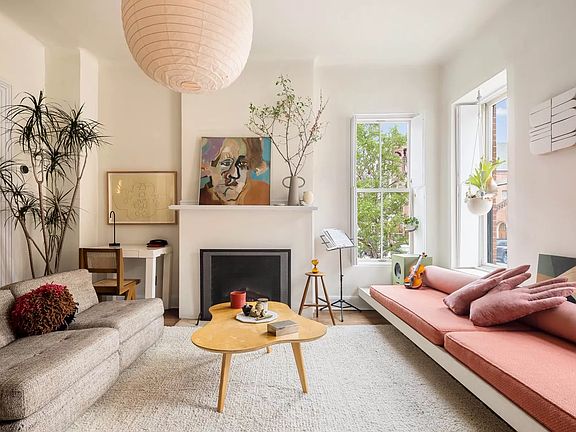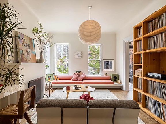 STYLE THROUGH THE YEARS Built in 1862, this three story French Second Empire style townhouse sits resolutely on the southwest corner of Gates and Waverly. Topped with a mansard roof and finished with a wraparound garden by Brook Landscaping, this five bedroom, two and a half bath townhouse offers all the space, grace, style and parking you want in Prime, Historic Clinton Hill. Enter into the long entry hall and unwind. To the right is the living room with ample space to stretch out, fireplace and custom built-in seating and record storage. The living room has east and north exposures and connects with the open kitchen and dining room. With enough space to seat 10, the center stage of culinary delight is to the left, past the working center island with bar stools and more than enough space to have helpers. Stove is Viking. Fridge is Sub-zero. The second floor is the full floor primary suite with garden facing bedroom, front den/TV room/adult hang out, pass through closet, dressing room and full bath with soaking tub and shower. The third floor offers birds eye views of the neighborhood from three exposures. The two main bedrooms both have two exposures and plenty of storage. The study faces east and has the most majestic color walls we've seen in years. An abundance of storage in this room counters the eye candy. The shared bath with west facing window has a built in infrared sauna, bath and shower. The bright basement has a rec room for craft and creativity while the other side of the floor holds surf and skateboards and bikes, a whole house water filtration system, laundry, a half bath and door to the backyard and driveway. The backyard offers parking and a garden bed to engage your green thumb. The backyard's generous parking spot has been used as an entertaining space or a driveway with steps to the lower level entry. Near all the amenities on Greene, Dekalb and Fulton Aves, as well as being a few blocks from Ft Greene Park and a few more from Prospect Park, this side of Clinton Hill allows for easy access to all by all modes of transportation. Clinton/Washington station is 1. 5 blocks away. Ask us about our favorite restaurants and shops!