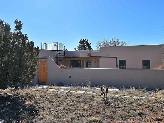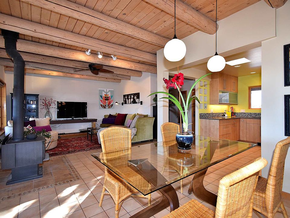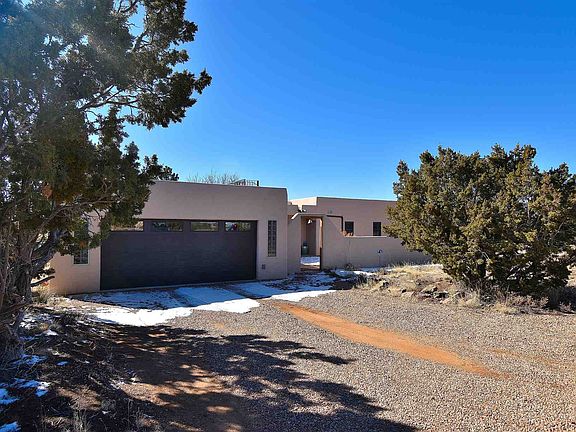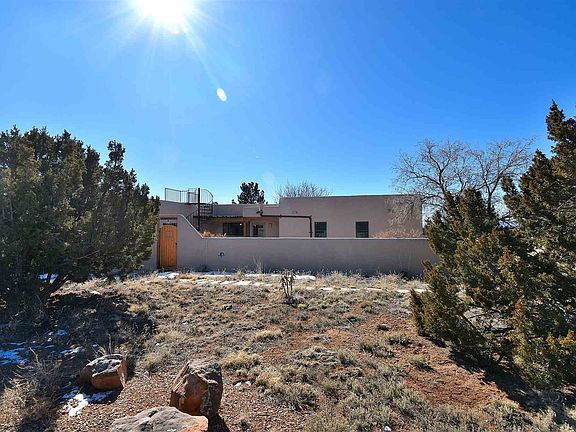 Light and airy Eldorado home featuring a sleek new kitchen, a new finished 2 car garage and a spacious and private front courtyard with a spiral staircase to a roof deck for enjoying the expansive views. This home blends old and new with charming ease. The tile floors and beautiful woodwork show off the home's Santa Fe style while the kitchen adds a modern burst of color, style and functionality. The open floor plan, living, dining and kitchen make entertaining easy. And outdoor grilling and socializing is convenient on the spacious back portal. The three sunny bedrooms are to the right of the entry and the private master bedroom has French doors to the backyard and is only a few steps from the hot tub. Additionally, there is a big bonus room and an unheated workshop which was the original garage. The home backs to abundant open space and mountain views. Don't miss this one.