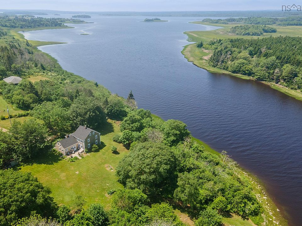 Welcome to the Abraham Lent House, a beautiful estate that blends magical four-season Nova Scotia vistas with New England Colonial charm. Set on 4.3 acres in the quaint community of Tusket, this extraordinary point-of-land property boasts 780 feet of water frontage, showcasing the incredible 15-foot tides of the Tusket River. Here, stunning sunsets give way to some of the best stargazing in North America. The home radiates timeless character, with a majestic lion door knocker on a double Dutch door, crown moldings, chair rails, wood floors, brass doorknobs, cozy brick fireplaces, wood beams, a boat porthole in the ceiling, and a stained glass door. The original entrance hall with staircase, elegant dining and living rooms with fireplaces, and a kitchen with wood stove set the stage for warmth and tradition. Three bedrooms, all with magnificent water views, two full washrooms, and an expansive sunroom complete the living spaces. Above the kitchen, an open loft awaits your dream studio or additional bedroom. Modern updates include new electrical with a 200-amp panel, full ducted heat pump, and a thoughtfully renovated kitchen. Outdoors, various farm outbuildings, one already wired, offer potential for projects or ventures. Low-maintenance perennial gardens, private patios, stone paths, fruit trees, and centuries-old oaks enrich the setting. Just 12 minutes from Yarmouth, yet with local amenities nearby, this property offers the lifestyle you’ve always imagined—seals in the river, eagles overhead, and endless coastal beauty.