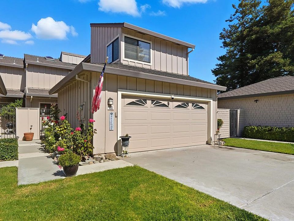 Situated on a 1904 sq ft lot, the home includes two en suite bedrooms, each with a walk-in closet, and two full bathrooms with a shower over tub and additional half bath on the ground floor. The Hollister Elementary School District serves this location. Central AC and ceiling fans ensure year-round comfort. A two-car garage adds practicality to this welcoming home. A must see..