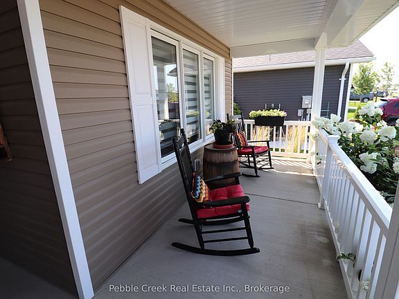 Wow! This immaculate bungalow backs onto green space and is a located just a short walk to the rec center and lake access in the very desirable Bluffs at Huron! This impressive Lakeside with sunroom model offers 1455 sq feet of living space along with a long list of upgrades! When you walk up to the home you will be impressed with the landscaping, maturing trees and inviting front porch! Once inside, you will be delighted with how welcoming the home feels along with all of the luxurious finishes. The custom designed kitchen features an abundance of cabinetry with crown moulding, soft-closing doors, upgraded appliances, enlarged center island, tile backsplash, under cabinet lighting and gorgeous quartz countertops. The kitchen is open to the living room and sunroom which both feature upgraded tray ceilings. Terrace doors lead from the sunroom to a spacious south-facing wraparound deck with a gazebo and glass panel deck surround for unobstructed views of the countryside! Additional features include upgraded hard surface flooring throughout, upgraded lighting and pot lights, a large primary bedroom with walk-in closet and 3pc ensuite bath, spacious spare bedroom and a 4 pc main bath. There are plenty of storage options available in the home as well, with lots of closets, extended height crawl space and 2 car garage. This impressive home is located in an upscale land lease community, with private recreation center and indoor pool and set along the shores of Lake Huron, close to shopping and several golf courses. Call your agent today for a private viewing!