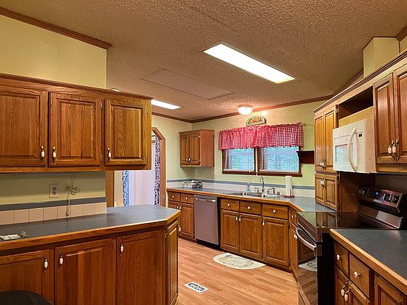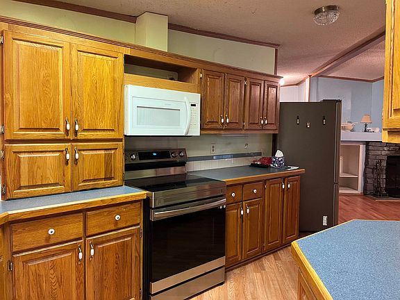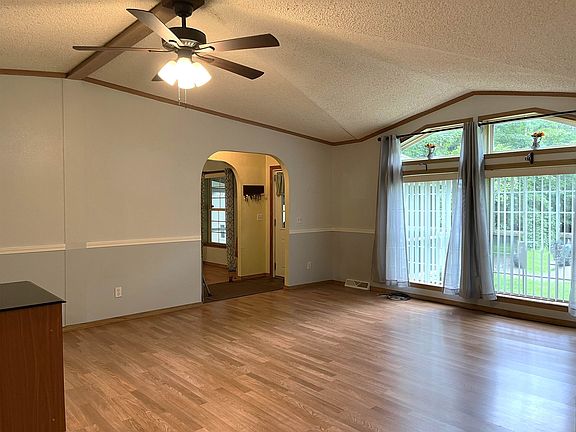 Come take a look at this large double wide tucked away from the road on almost an acre of land. The interior features a large living room with a separate family room with a wood burning fireplace. The kitchen offers plenty of cabinet and counter space and newer appliances. The dining area has a sliding door to the back deck. The large primary suite features a soaking tub, separate shower and a dual sink vanity. Two more bedrooms on the other side of the house share a full bath. The laudry room has a utility sink and access to the outside. The furnace is brand new! You will enjoy the sceened in porch off the front of the house. Plenty of room for storage and hobbies in the heated detached garage at the front of the property and the oversized storage shed in the back.