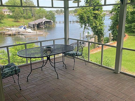 Grand older waterfront home on 1.3+ acres with protected water and wide water views. Family room with hardwood floors and fireplace, dining room with hardwood floors facing the water, large screened porch on waterside with brick floor, side screened porch, oil forced air heat, metal roof, deep well, vinyl siding, large unfinished basement, new windows, 1-car garage, fruit trees.