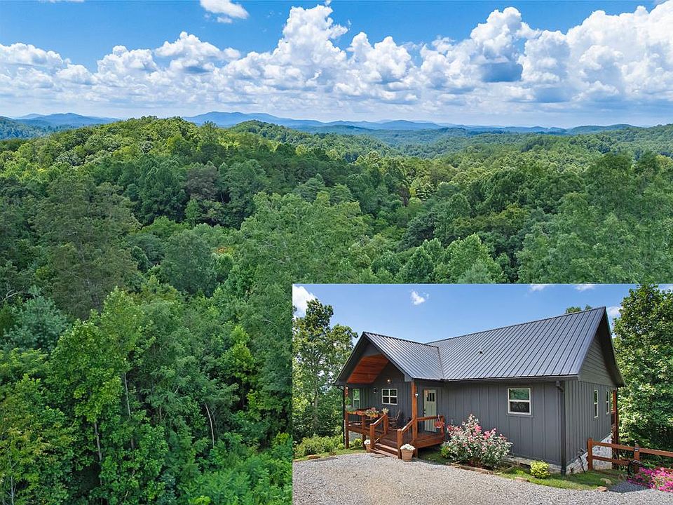 Welcome to this beautifully crafted 3-bedroom, 2-bathroom single-level home on over 2 wooded acres with distant mountain views and end-of-the-road privacy! A gravel driveway leads you directly to the inviting front porch, offering convenient parking and a warm welcome. The home features a durable metal roof and charming curb appeal with thoughtfully maintained landscaping. Step onto the front porch and into the open Great Room, where you'll be greeted by a soaring vaulted tongue and groove ceiling, stunning chalet windows that bathe the space in natural light, and a striking floor-to-ceiling stacked stone fireplace. Rich wood floors run throughout the home, creating warmth and continuity. A glass door opens from the Great Room onto the full-length back porch overlooking the fully fenced backyard. The adjacent kitchen features granite countertops, a central island, stainless steel appliances, generous cabinet and counter space, and a nearby laundry area for added convenience. The split-bedroom layout offers privacy, with the Master Suite located on one side of the home. The Master bedroom has a vaulted ceiling, direct access to the back porch, and a spacious walk-in closet. The luxurious ensuite bathroom has tile floors, granite countertops, double vanities, and a custom tile walk-in shower. Across the Great Room, two guest bedrooms also feature vaulted tongue and groove ceilings and share a stylish guest bath with tile floors, granite counter, and a custom tiled tub/shower combo. Additional features include crawl space access from the yard, high-speed internet, and a UV water filtration system last tested in May 2025. This home offers the perfect blend of rustic charm and modern comfort in a peaceful, scenic setting.