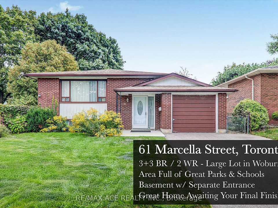 Big, bold, and brimming with potential welcome to 61 Marcella Street, where your dream home or next investment starts with over 2,000 sq ft of space to play with. Located in the heart of Woburn, one of Scarborough's most underrated neighbourhoods, this property delivers space, location, and income potential all in one package. Upstairs you'll find a sprawling 1,230 sq ft layout that's been lovingly maintained by the same owner since 1969. Translation: strong bones, solid layout, and a home that's never been rushed through a cheap flip. Its the kind of place you can trust and then tailor to your taste. Downstairs, the 800 sq ft basement with a separate side entrance is practically begging to be turned into a rental suite, in-law apartment, or mortgage helper. Want a home that pays you back? This is it. The lot itself is no slouch either. You get serious curb appeal out front, and a huge private backyard out back perfect for BBQs, gardening, or letting the kids and pets run wild. Add in the fact that there's no rental equipment to weigh you down, and you're already ahead. The lifestyle perks? You're within walking distance to Willow Park Junior Public School, Cedar Ridge Park & Creative Centre, and Highland Creek Park (complete with a scenic creek and mini waterfall). If golf is your thing, the prestigious Scarboro Golf Club is just three minutes away. If not, the endless trails and greenery nearby might win you over instead. Bottom line: this is a big home in a great area with even bigger potential. Its move-in ready, but its also ready for your vision whether that means modern updates, rental income, or both. Opportunities like this don't hit the market every day. Bring your tools, bring your imagination, and get ready to unlock everything this home has to offer.