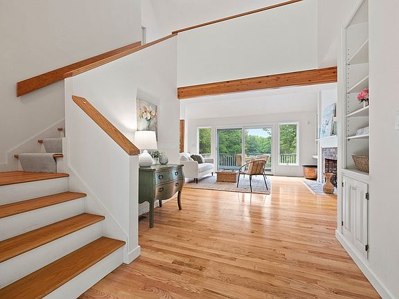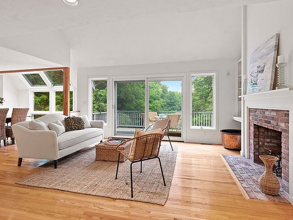 This beautifully designed contemporary Cape on a cul-de-sac features clean lines and an open floor plan bathed in natural light. The open kitchen overlooks the dining area and living room with custom built-ins and fireplace. Hardwood floors shine here and into the first-floor primary suite. This suite also boasts a recently renovated full bath and laundry area. A second bedroom or office completes the first floor. Upstairs, you'll find two spacious bedrooms and another full bath. Skylights and high ceilings enhance the airy feel throughout. The full walkout unfinished basement offers endless potential for a recreation room, gym, or second home office. 2 car garage with ample storage plus a second entrance, mudroom area, and pantry for convenience. Enjoy tranquil views from the deck overlooking the rolling lawn and conservation land beyond. Conveniently close to commuting routes and featuring the highly-rated Acton Boxborough schools, this home is a perfect blend of comfort and style.