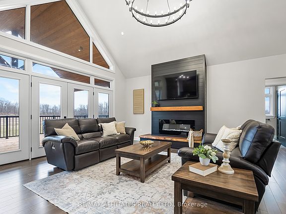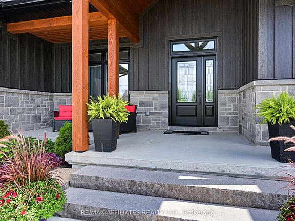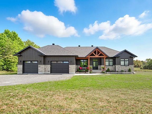 Set on a 2-acre lot, this stunning custom-built 2024 bungalow offers the best of both worlds, serene country living with convenient access to Perth, Smiths Falls, and the breathtaking Big Rideau Lake. From the moment you arrive, the homes undeniable curb appeal sets the tone. A beautifully landscaped entrance, soaring timber accents, and meticulous craftsmanship welcome you into a space where no detail has been overlooked. Step inside to a bright, open-concept layout that seamlessly connects the kitchen, dining, and living areas. Gleaming hardwood floors, a cozy fireplace, and striking cathedral timber ceilings create an inviting atmosphere that's both elegant and comfortable. Large sliding doors open onto an expansive, covered back deck perfect for soaking up summer days or enjoying peaceful evenings surrounded by nature. At the heart of the home is a showstopping custom kitchen, featuring floor-to-ceiling cabinetry, generous counter space, and a massive island ideal for family gatherings and entertaining. The main level offers a spacious primary suite with a luxurious ensuite and walk-in closet, along with three additional well-appointed bedrooms. The fully finished, walk-out lower level is equally impressive complete with two more bedrooms, a dedicated office, and a sprawling recreation area, making it perfect for growing families or overnight guests. Thoughtful built-ins provide ample storage and lead seamlessly to a generous 3-car garage. This home is more than just a place to live its a place to fall in love.