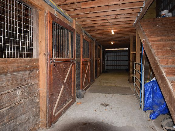 Built in 2000, this well-built 18-stall horse barn offers everything an equestrian could need, including a spacious tack room and convenient hay loft. The upper level features a comfortable office complete with a kitchenette, full bath, and laundry area-all heated and cooled by an energy-efficient ductless system. Step out onto the upper deck and enjoy sweeping views of a peaceful 10-acre meadow, which is also available for purchase. This exceptional property borders the Larkin State Bridle Trail, providing direct access for hours of scenic riding right from your doorstep. Please do not touch horses