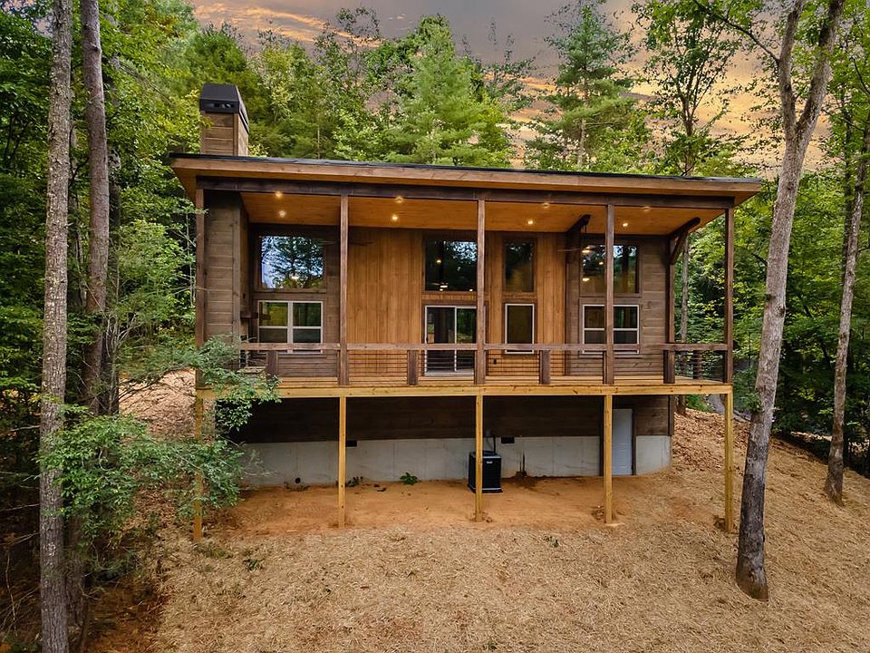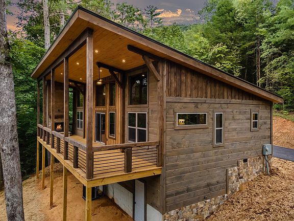 This beautifully crafted 2025 new construction home offers modern mountain living on 2.024 private, gently sloping acres in desirable Fannin County. Designed for comfort, style, and functionality, this single-level ranch-style home features 2 bedrooms, 2 full bathrooms, and quality finishes throughout. The exterior showcases timeless wood siding with stone accents, a durable metal roof, and both a welcoming covered front porch and a spacious covered back porch—complete with an outdoor fireplace perfect for year-round enjoyment. The asphalt driveway adds convenience and easy access in all seasons, and all roads within the subdivision are paved—an added bonus that enhances accessibility and appeal in this mountain community. Inside, the open-concept floor plan includes a family room and dining room combo with cathedral ceilings, a striking stone fireplace, and an abundance of windows throughout that bring in natural light and frame peaceful wooded views. The kitchen features an eat-in bar ideal for casual dining, and the combination of wood and tile flooring throughout adds warmth and easy care. The owner's suite offers a walk-in closet and a beautifully appointed ensuite bathroom with a tile shower, double vanity, linen closet, and a rustic sliding barn door for added character. The second bedroom is spacious and comfortable, with a full bath nearby. A separate laundry room with built-in shelving adds everyday convenience. Built on a crawl space foundation with thoughtful design and craftsmanship, this home is located in a quiet, scenic area near Blue Ridge and McCaysville—perfect for a full-time residence, weekend getaway, or vacation rental. Enjoy the peace and privacy of mountain living with the comfort of a brand-new, move-in-ready home.