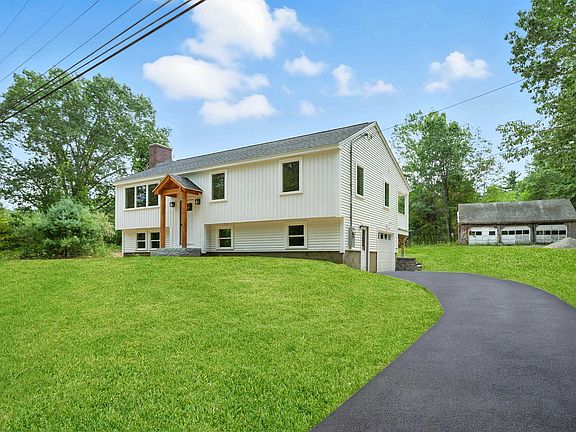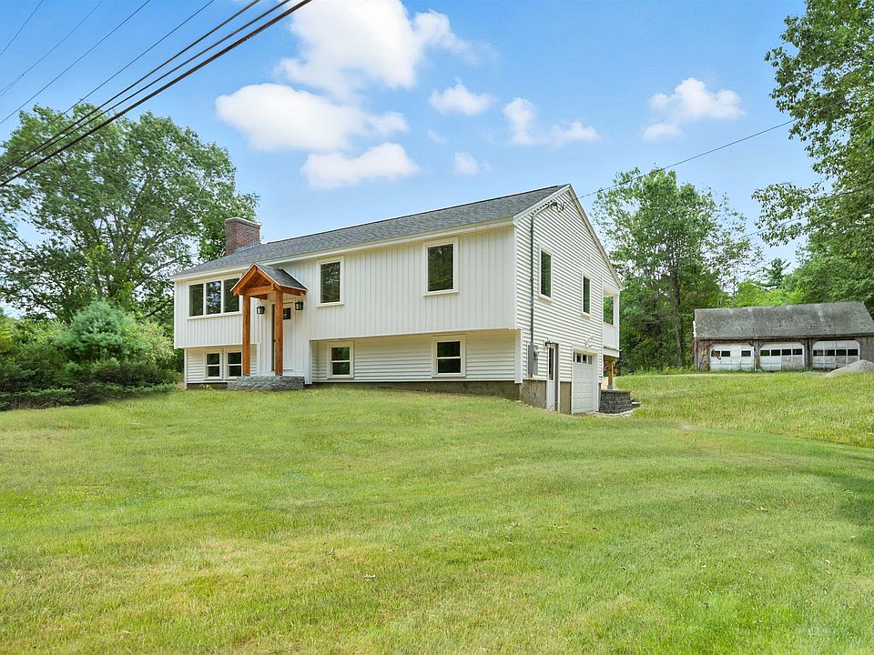 Welcome to your home sweet home in Sandown NH. This modern yet charming home has been completely renovated down to the framing with tasteful finishes throughout. Including beautiful red oak floors, custom cabinets and quartz counters. Sunny windows that let the outside in. The great room is perfect for entertaining with a cozy fireplace. Down the hall you'll find the full bath with tile and double vanities with silver pearl leathered granite which can also be found in the downstairs bathroom. Upstairs you will find 3 bedrooms with immense closets. Heading downstairs you'll find a bonus room think office space or playroom. The fireplaced living room is also perfect for entertaining. The utility room doubles as a laundry room. There is an attached 1 car garage but potential for another 3 bays or barn use with some TLC to the current outbuilding on property or it can be removed. Picture sitting on the covered porch waiting to see all the wildlife and enjoying all new England seasons have to offer or star gaze into the peaceful night. New septic to be put in prior to close as well as new lawn. Driveway to be paved. Agent interest.