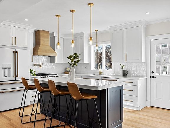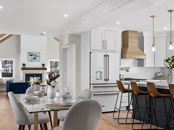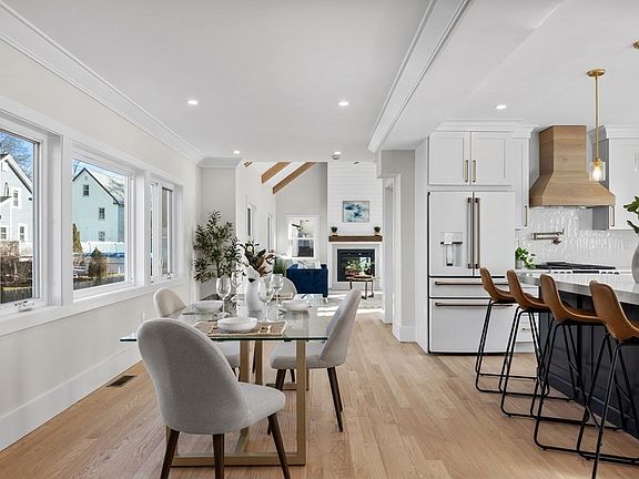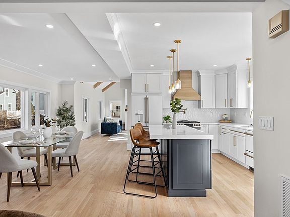 An exquisite home offering both indoor and outdoor living with a beautiful front porch that welcomes you to this meticulously renovated home on tree lined street and spectacular finishes. The first floor is welcoming with light colored hardwood floors with open living room, dining room and family room, and kitchen that seamlessly flow together. First floor also features bedroom on the main level. The two toned white and navy kitchen offers gorgeous CAFÉ appliances in matte white finish to compliment the style and decor of fully renovated kitchen. Kitchen opens to side deck for convenient entertaining and perfect for Summer get togethers! Family room has beamed cathedral ceilings with fireplace, built in seating, and more indoor/outdoor living access to side deck. Main bedroom is spectacular with beamed cathedral ceilings, luxurious main bath with gold accent and walk in closet! Second floor laundry, fully renovated full finished basement is perfect for family room, play room and more!