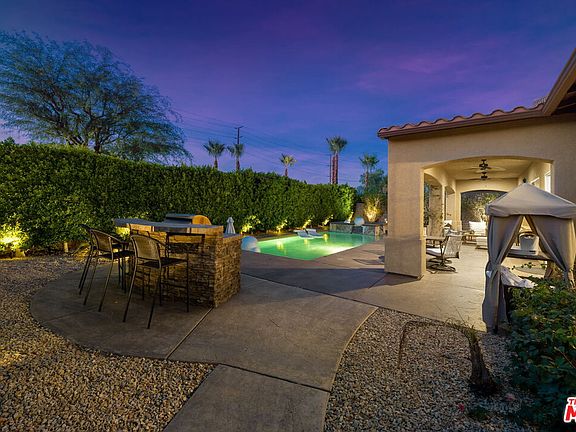 Serenity and privacy are hallmarks of this house! Located in the prestigious gated community of Santo Tomas on the Lake in Rancho Mirage, California, this three bedroom and three bathroom house has a private heated PebbleTec pool and hot tub to make for a very relaxing experience. Enter the grand dining room and experience the beautifully furnished home in this upscale community. Each well-decorated bedroom has its own bathroom. New stainless steel appliances await you in the kitchen, while new laminate flooring welcomes you into the massive living room and bedrooms. Fully grown ficus trees offer complete privacy for the backyard which includes ample relaxing and dining areas by the expansive pool and hot tub. Enjoy the exclusive social and sports membership to the Mission Hills Country Club included with your stay. Complimentary unlimited pool, tennis, fitness center, croquet, pickleball, and access to the restaurants and bar. Pets allowed. Landlord pays for pool, landscaping, and trash. Tenant pays for gas, water, flat electricity fee of $250.00 per month, and tv/internet.