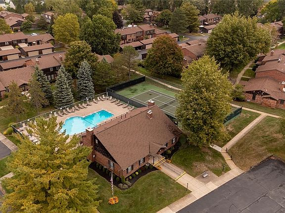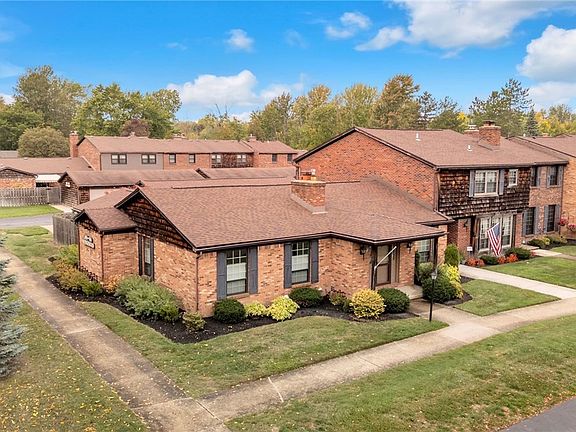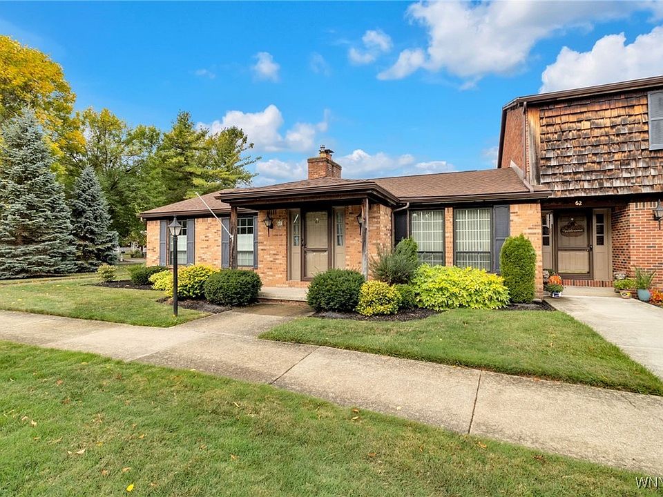 Welcome to Wedgewood Commons—a highly sought-after community in the Williamsville School District offering the benefits of condominium tax status, stress-free exterior maintenance, and access to fantastic amenities including a clubhouse, saunas, in-ground pool, and tennis courts! This end-unit ranch-style home provides over 1,800 SF of living space with 3 bedrooms, 2 full baths, a 2-car detached garage, and a full basement. Step inside to find a dual coat-closet foyer that opens to a spacious living area highlighted by a painted brick gas-insert fireplace, lush premium carpets, soaring cathedral ceilings, and abundant natural light from a large picture window. The kitchen features granite countertops with under-mount lighting, oak cabinetry, stainless steel appliances, and hardwood floors flowing into the formal dining room with vaulted ceiling and sliding glass doors leading to a private stamped concrete patio with awning—perfect for outdoor dining or quiet relaxation amidst beautifully landscaped gardens. The primary ensuite retreat offers vaulted ceilings, a walk-in closet, updated granite vanity, and a stunning zero-lip tiled shower with two-way glass doors. Down a private hall, two additional bedrooms with generous closets are serviced by a full bath offering tiled tub/shower walls and solid surface vanity. The basement extends the living space with a partially finished area, abundant built-in shelving, and a walk-in cedar closet. Mechanical updates include: high-efficiency furnace, central air, newer HWT (2019), sump pump, glass block windows, and solid oak doors throughout. Rear ramp access from the garage can remain for convenience or be easily removed. Note- some images have been virtually staged. With its prime location, turnkey updates, and community amenities of an inground pool, tennis courts and clubhouse - this home blends comfort, convenience, and carefree living—don’t miss your chance to experience the best of Wedgewood Commons! Seller will consider offers on Monday 9/29 at 12pm.
