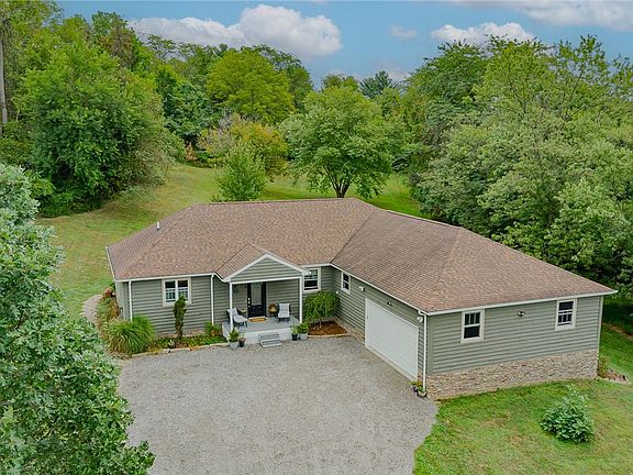 Welcome to your dream retreat! This stunning 3-bedroom, one-level ranch sits on just over 8 picturesque acres, partially wooded for privacy and serenity. Step inside to an open-concept living, kitchen, & dining area, bathed in natural light with vaulted ceilings and warm engineered hickory floors throughout. The chef’s kitchen boasts rich cherry soft-close cabinets, granite & butcher block counters, SS appliances, and plenty of cabinetry. The primary suite is a true sanctuary, featuring a spa-like bath with travertine tile, a soaking tub, and a beautifully detailed ceramic shower. You will love the oversized first floor laundry area! Downstairs, enjoy an expansive finished game room complete with a wet bar! A striking stacked stone archway leads to a custom wine cellar, adding a touch of character. Outside, you'll find full camper hookups, a two-car attached garage, and even a blueberry patch! This is the perfect blend of comfort, style, and nature...your forever home awaits!