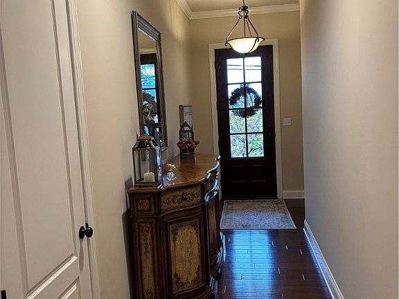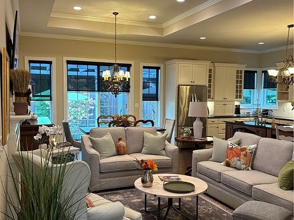 This three bedroom, 3 1/2 bath exquisite home is a MUST SEE! Enjoy all of the beautiful upgrades such as 10' ceilings with step ceilings rising to 11' in the living room & dining room area as well as the primary bedroom, crown molding throughout, including in all bedrooms, all bathrooms, living room, dining room, kitchen, entry and laundry room, as well as in the step ceilings. Hard surface floors flow throughout (upstairs hardwood, lower level laminate). The primary bathroom has a large walk-in shower, jetted tub, double sink vanity and private water closet. All bathrooms have large format, upgraded porcelain tile. You will love entertaining indoors and outdoors in this home with two complete custom kitchens with built-in appliances, beautiful cabinetry with soft-close doors and drawers and large islands in both or on the paver patio. The main level kitchen has granite countertops and the lower level features a Carrara marble style