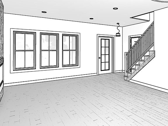 Stunning stone fireplaceBlack windows and doorsWhite vertical sidingSpacious open concept livingSerene primary suiteLuxurious tile shower