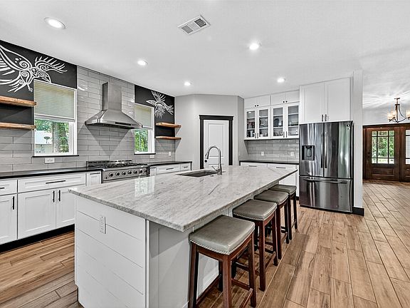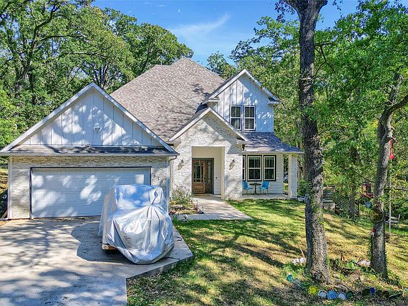 Stunning modern farmhouse nestled in an established neighborhood in West Denison, TX! This open-concept home features a gourmet kitchen complete with stainless steel appliances, abundant cabinetry, and a spacious island for entertaining. The expansive primary suite on the main level offers a custom walk-in closet and a luxurious spa-like bathroom with a separate tub, shower, dual sinks, and connects to the utility room. The floor plan includes two bedrooms downstairs and two upstairs, along with a large game room. The picturesque 0.8-acre lot features a covered slate patio, mature trees, plenty of open space, and a charming treehouse overlooking a creek and footbridge, creating a fairytale-like setting.