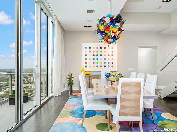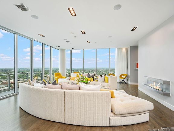 This stunning penthouse in the heart of downtown San Antonio, directly overlooking the River Walk, boasts panoramic views of the beautiful city skyline. This two-story residence, located on the 33rd and 34th floor, sits atop the Grand Hyatt Hotel and encompasses over 6,000 square feet of interior and exterior luxury living. Natural light floods the contemporary interior from the floor-to-ceiling windows. With five bedrooms, six bathrooms, three living areas, and a spacious terrace, there is plenty of space for comfortable living and festive entertaining. The corner living room has a sophisticated wall-mounted fireplace and a North-facing balcony. The iconic primary suite has a private balcony showcasing the Tower of the Americas and a spa-like bathroom with a free-standing tub and dual sinks. A glass and wood staircase that perfectly blends form and function connects the two floors. Residents enjoy some of the best views in the city and have access to a host of amenities, including a rooftop pool and 24-hour concierge service. This urban penthouse retreat is the perfect combination of luxury and convenience with being steps away from the city's top restaurants, museums, theaters, the new Civic Park at Hemisfair, and the iconic San Antonio River Walk.