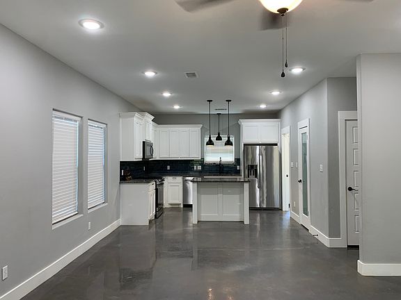 The designer concrete floors add a touch of sophistication and durability throughout the main living areas, while large windows invite abundant natural light, creating a bright and welcoming atmosphere.