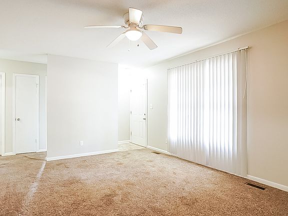 The living room opens with soft carpet underfoot and large windows that fill the space with natural light. Its open footprint provides a smooth transition toward the dining and kitchen areas, creating a comfortable daily flow. In the kitchen, you'll find stainless steel appliances, ample cabinetry, and durable flooring designed for easy upkeep.