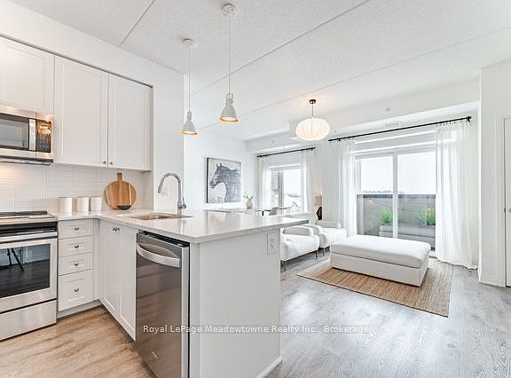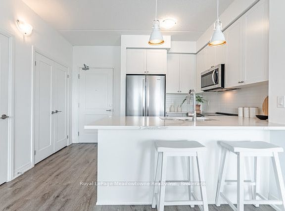Welcome to 6TEN Condos - Modern Living in the Heart of Milton! This bright and spacious 1-bedroom corner suite offers 863 sq ft of stylish open-concept living. Originally designed as a 2-bedroom floorplan, it was customized by the builder to create a grand and airy primary bedroom. The wall can easily be reinstalled to restore the original layout, offering flexibility for your lifestyle needs. Enjoy 9-foot ceilings, large windows with southeast exposure, and modern finishes throughout. The kitchen features quartz countertops, stainless steel appliances, subway tile backsplash, and a double undermount sink with a chrome pullout faucet. Additional features include in-suite laundry, underground parking, and access to the building's fitness facility and bike storage. Designed with energy efficiency in mind, 6TEN Condos offers LED lighting, Low-E Argon windows, and a centralized hydronic boiler system for enhanced comfort and lower utility costs. Located in a convenient, walkable area close to shopping, restaurants, trails, and Milton GO, this suite combines modern comfort, urban convenience, and beautiful natural light - a perfect place to call home.