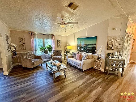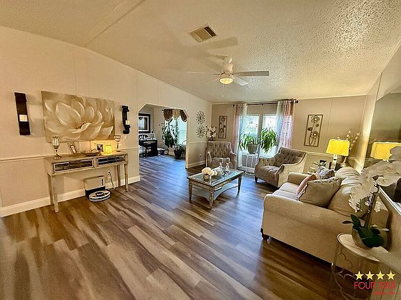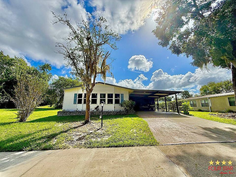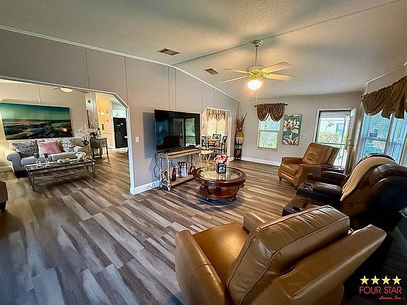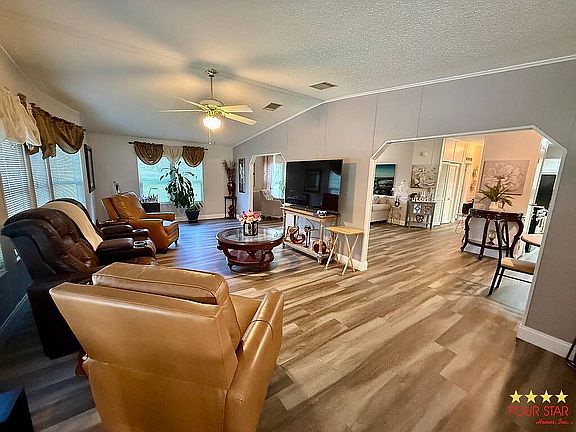 This beautifully maintained manufactured home in a desirable 55 plus community offers both space and style, featuring a large living room as well as a separate den, perfect for entertaining or relaxing. The home has been upgraded with brand new luxury vinyl plank flooring throughout, giving it a modern, polished look. Freshly painted in neutral tones, the interior feels bright, welcoming, and move-in ready. The kitchen has been refreshed with newly painted cabinets and a new stove, providing both charm and functionality. Additional updates include tinted replacement windows across the front of the home and a washer and dryer that are less than a year old. One of the most appealing features of this property is its setting. The home overlooks peaceful green space and has an empty lot next door, creating extra distance between neighbors and offering a sense of privacy that is hard to find. A very large screened room expands your living space and is the perfect spot to enjoy the fresh air year-round. Outside, you will appreciate the convenience of the double-wide carport, allowing two vehicles to park side by side without the hassle of moving cars. Pride of ownership is evident throughout this stunning property, making it a true gem in an active and friendly community. This home will sell quickly. Call today for a showing.