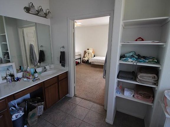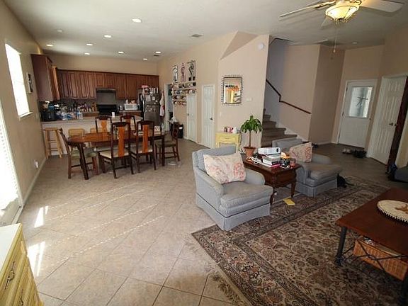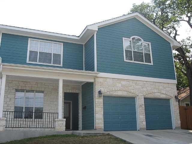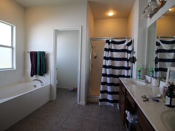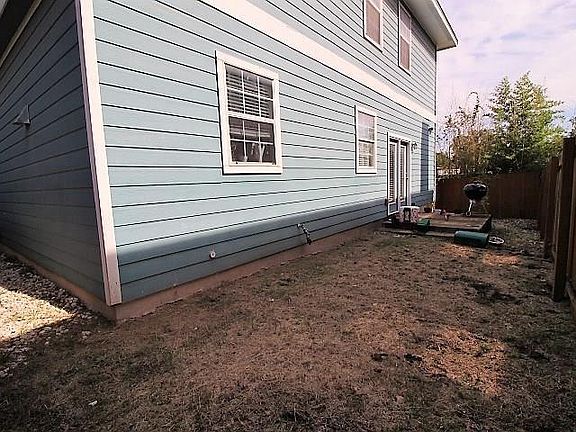 Modern house with 4 large master bedrooms, one downstairs room and 4.5 bathrooms. It has a small fenced yard and a 2-car garage.